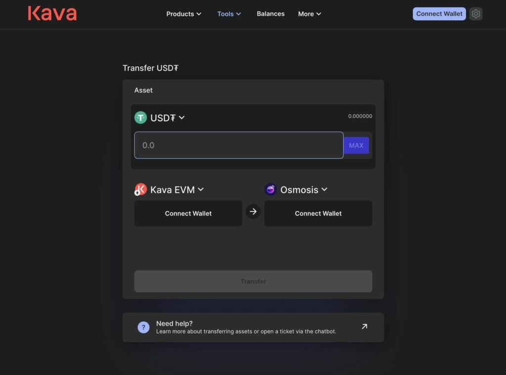 We are ready to transfer USDT to Osmosis. I’ve tried to transfer USDT to Osmosis by TFM but with no result. But official Kava webapp transferred it with no problems. Connect both wallets to the interface and you are good to go.